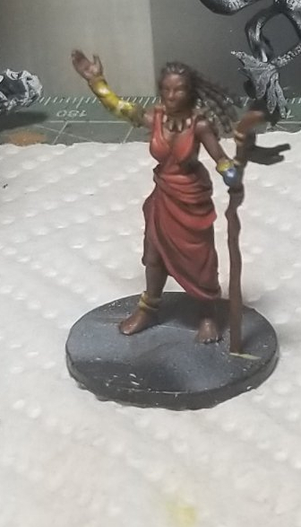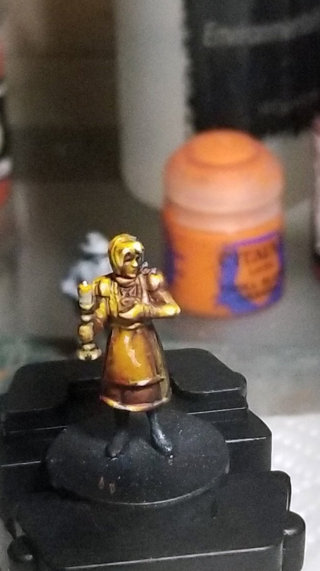 Instead of giving the model static form and shape by painting the flesh tones and her dress, I wanted to try to tell a story by just using a few colors. By using only yellows oranges and reds, I tried to give the feeling that she was lost in a truly dark place with only a small candle to provide any light. Which seemed appropriate given the she comes from a game about exploring a mansion haunted by H.P. Lovecrafts various eldar gods. Unfortunately, this effect comes off a bit exaggerated here, more like she’s in the middle of a raging inferno, but it was a fun learning exercise anyway.